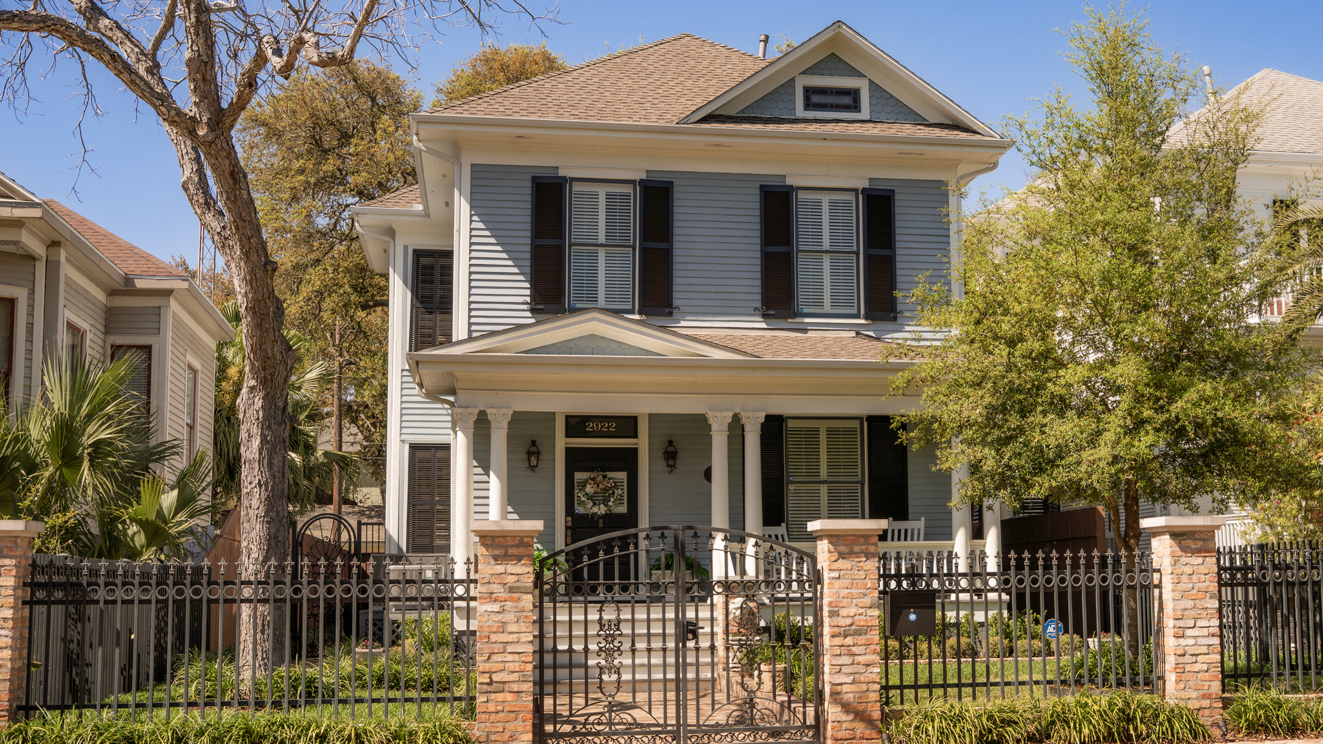 This two-story frame dwelling with a double-gallery and Colonial Revival features was built in August 1914 for use as tenant property by wholesale merchant Charles John Wolfer. Born in Galveston in 1880, Wolfer was the son of Christian Ludwig Wolfer, a German immigrant who established himself as one of the island’s most prominent and prolific contractors. The house is one of several houses in the area built by the Wolfer family. Part of the neighborhood of San Jacinto, the Wolfer house is located in the Lost Bayou Historic District listed on the National Register of Historic Places (2017).