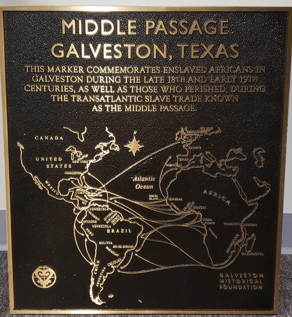 This marker commemorates enslaved Africans in Galveston during the late 18th and early 19th centuries, as well as those who perished during the transaltantic slave trade known as the Middle Passage.