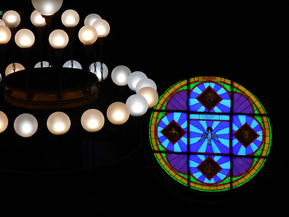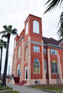 Directly in front of the pipe organ is the pulpit area, flanked on each side by seats for the choir. The handcrafted altar rail forms a semi-circle in front of the pulpit and choir stand. The baptismal fountain and lectern are original to the church and are crafted of oak with the same hand-carved detailing found throughout the church. The three chairs for the ministers’ use as well as the three-tiered chandeliers date to the early 1900s. The stained glass windows are original works of art donated by individual parishioners and church organizations. One window was donated in memory of AME Bishop Josiah Haynes Armstrong (1842-1898), who is buried in Galveston.