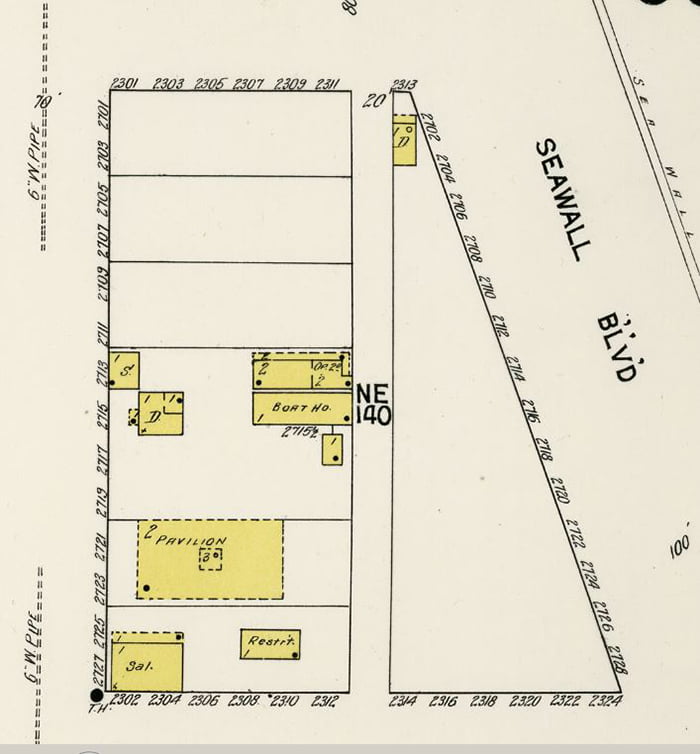 During the Great Storm on September 8, 1900, McGuire’s father perished and his property along Avenue R was destroyed. He maintained ownership of his lots and built his family a new residence in 1901. On November 8, 1904, the Galveston Daily News reported that McGuire had purchased a third lot on his block and in 1910, the paper reported that McGuire and two partners had applied to the city of Galveston for a license to organize the McGuire Park Company. Once granted, the company erected a two-story frame pavilion for entertainment on the corner of 28th and Avenue R. The 1912 Sanborn Fire Insurance Map recorded a footprint of the building, which was topped with a third-story cupola.