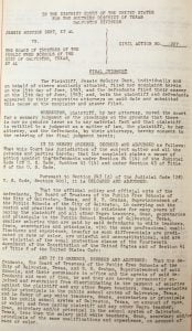 McGuire Dent’s lawsuit was the second such lawsuit filed in the state. In 1942, Durham filed the first equal pay lawsuit against the Dallas school board on behalf of Dallas educator Thelma Elizabeth Page. After the rulings in favor of Page in 1942 and McGuire Dent a year later, school districts across the state started to settle pay disputes with little fanfare. McGuire Dent’s ruling, issued in Galveston, Texas, on June 15, 1943, by United States Judge T. M. Kennerly ruled for the plaintiff and instructed the Galveston school district to equalize pay for African American teachers, deans, secretaries and principals over a period of three years.