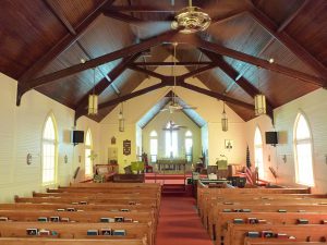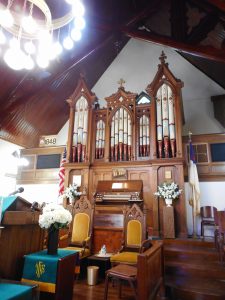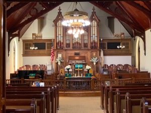 The sanctuary features an arched ceiling of polished wood enhanced and supported by decorative beams. The 1876 Hook and Hastings tracker action pipe organ with its High Victorian Gothic case was originally at Trinity Episcopal Church. It was purchased by the congregation of Reedy in 1912 and is one of only two organs of this type in the country today.