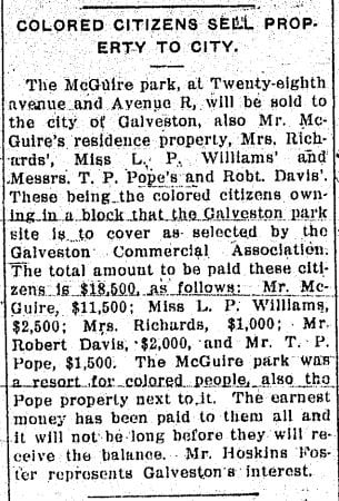 “The McGuire Park, at twenty-eighth Avenue and Avenue R, will be sold to the City of Galveston, also Mr. McGuire’s residence property, and Mrs. Richards’, Miss L. P. Williams’ and Messrs. T. P. Pope’s and Robt. Davis’. These being colored citizens owning in a block that the Galveston park site is to cover as selected by the Galveston Commercial Association. The total amount to be paid these citizens is $18,500, as follows: Mr. McGuire, $11,500; Miss L. P. Williams, $2,500; Mrs. Richards, $1,000; Mr. Robert Davis, $2,000; Mr. T. P. Pope, $1,500. The McGuire Park was a resort for colored people, also the Pope property next to it. The earnest money has been paid to them all and it will not be long before they will receive the balance. Mr. Hoskins Foster represents Galveston’s interest.”