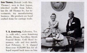T.D.’s personal wealth was noted in printed articles published in Ebony magazine and other publications. In September 1961, Ebony magazine included an story about T. D. titled “Negro Politician Makes Good in Texas- Plantation-born ex-teacher rises to wealth and post on Galveston City Council,” followed by an article in the May 1962 issue of Ebony that declared T. D. one of “America’s 100 Richest Negroes.” The list also included Harry Belafonte, Nat King Cole, Johnny Mathis and Floyd Patterson.
