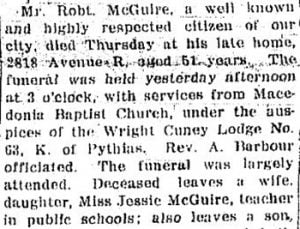 In 1888, McGuire married Alberta Mabson. Three children were born to their uni on: John Edward Lee (1888-1948), Jessie Mae (1892-1948), and Roberta (1895-1908). The 1900 U.S. Census recorded the family living at 2717 Avenue R. The record noted McGuire was employed as a city policeman and owned his property on Avenue R free of mortgage. In addition to the family of five, McGuire’s household included a 22-year-old African American servant named Victoria Douglas as well as his father, John McGuire.