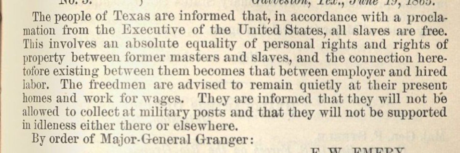 The people of Texas are informed that, in accordance with a Proclamation from the Executive of the United States, all slaves are free. – General Orders, No. 3