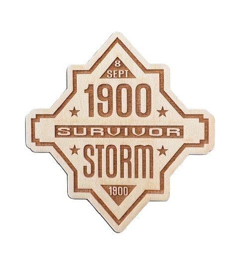 A wooden replica of our 1900 Storm Survivor plaque. 2.5 x 2.75 inches