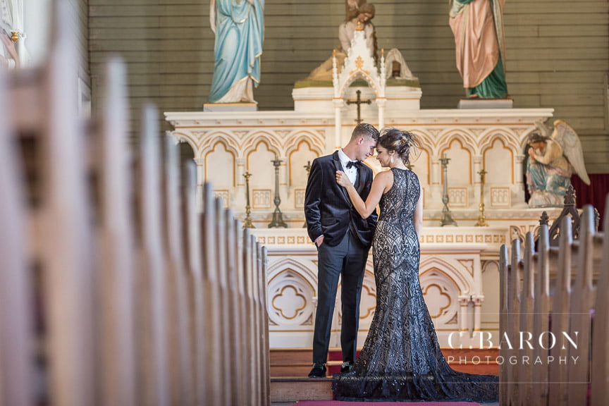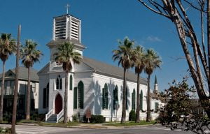 The oldest German Catholic Church in Texas and the oldest wooden church building in Galveston, St. Joseph’s was built by German immigrants in 1859-60. Bishop John Odin, the first Catholic bishop of Texas, recommended that a church be built for the German-speaking Catholics of the growing city. The church was dedicated in April 1860, to St. Joseph, the patron saint of laborers. The building is a simple wooden gothic revival structure, rectangular with a square bell tower with trefoil window. The softly painted interior features a coffered ceiling with painted quatrefoils and other gothic symbols, plaster of Paris Stations of the Cross with German inscriptions dating from the early years of the 20th century and the original, elaborate main and side altars with reredos as well as many of the original statues and altar furnishings.